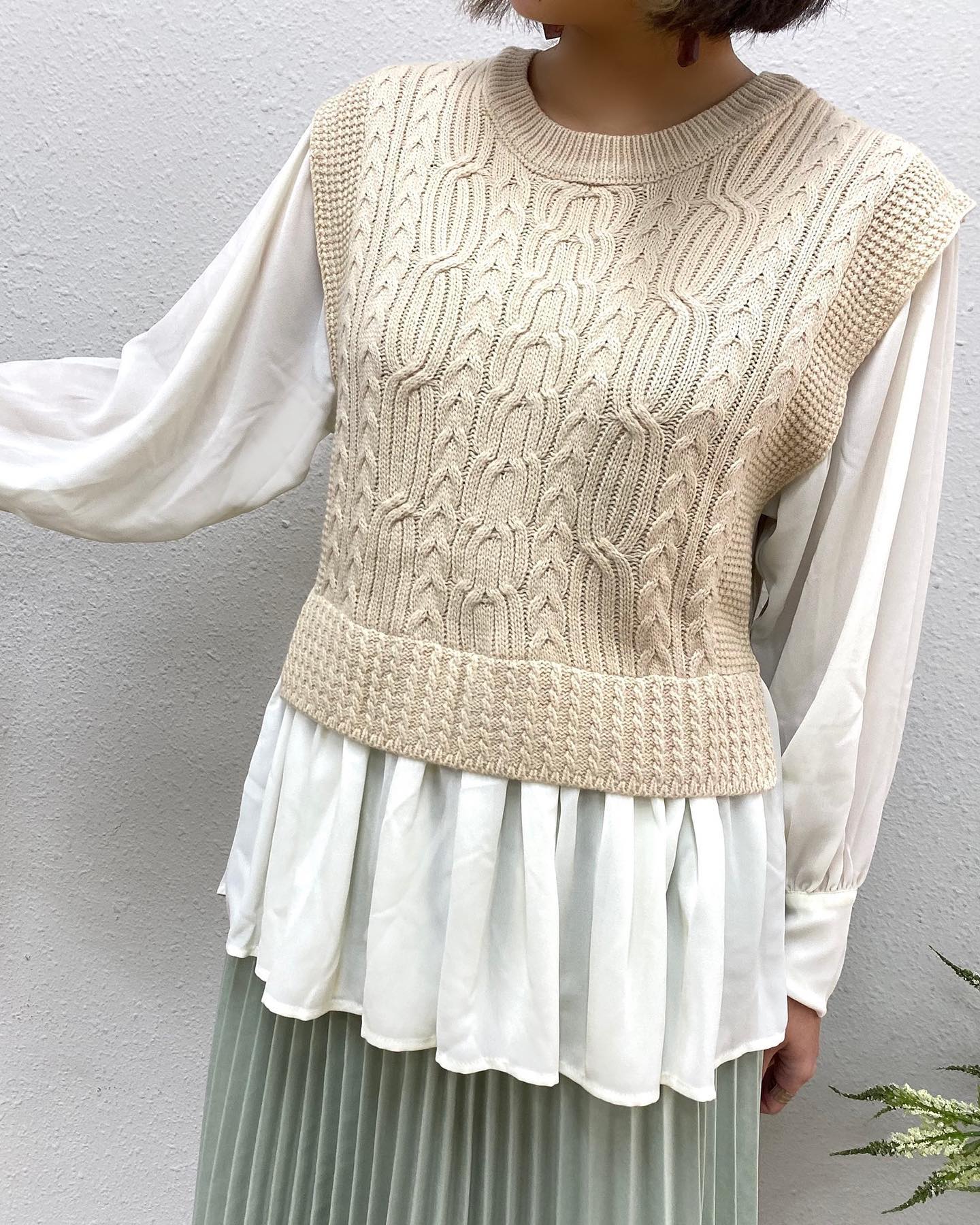 .【new arrival】?RP156412B001 ケーブル切替ドッキングニット▷¥3,190(税込)(店舗今週入荷.オンライン近日入荷予定)∥color∥ white / L grey / blueシャツ部分がシフォンになって春らしく切替からのボリュームあるギャザーが …