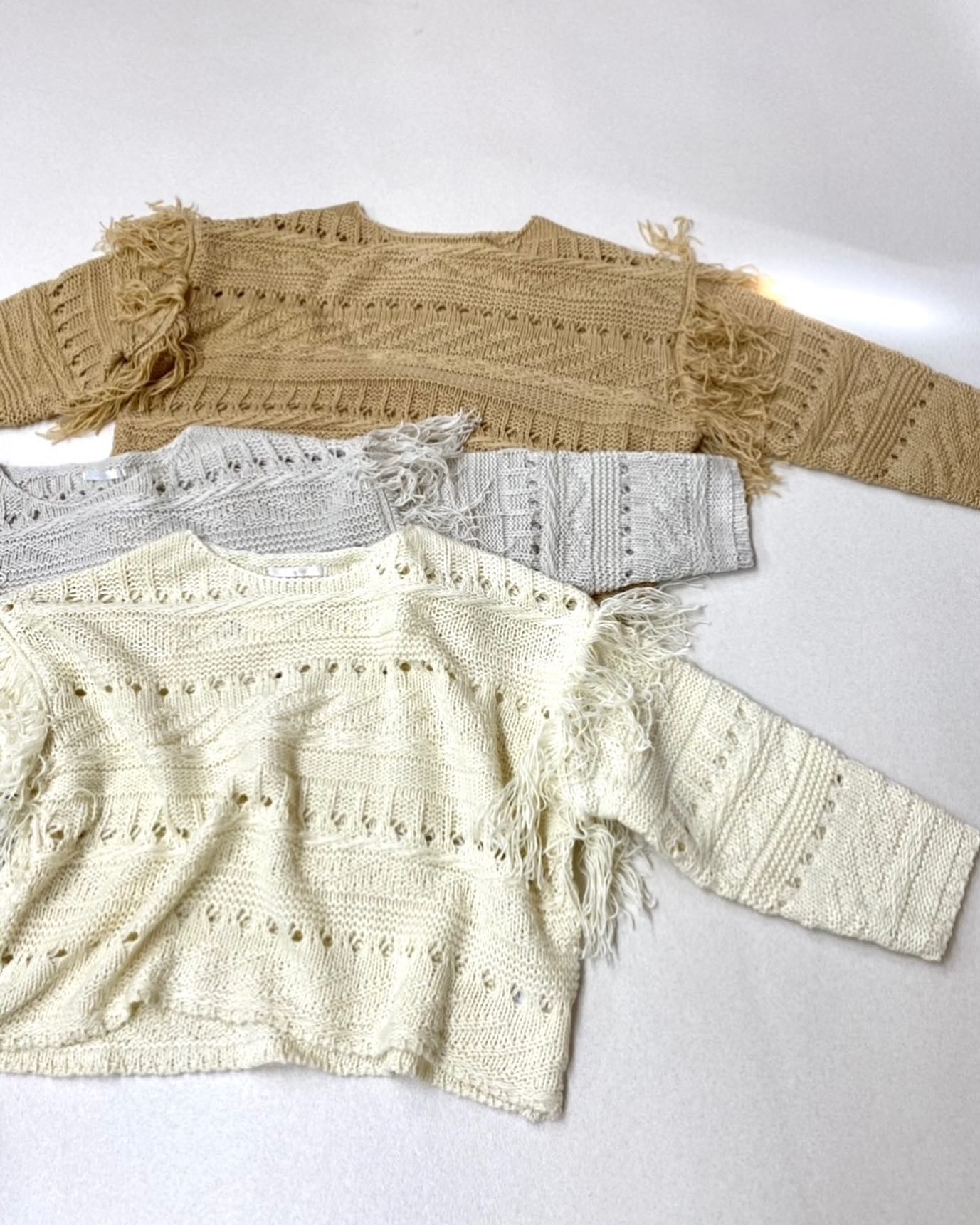 .【new arrival】?RP156412T002 透かし編みニットPO▷¥3,190(税込)(店舗今週入荷予定.オンライン近日入荷予定)∥color∥ white / yellow / L grey人気のフリンジデザインから春まで着れる編みがかわいいニットが登場 #retro …