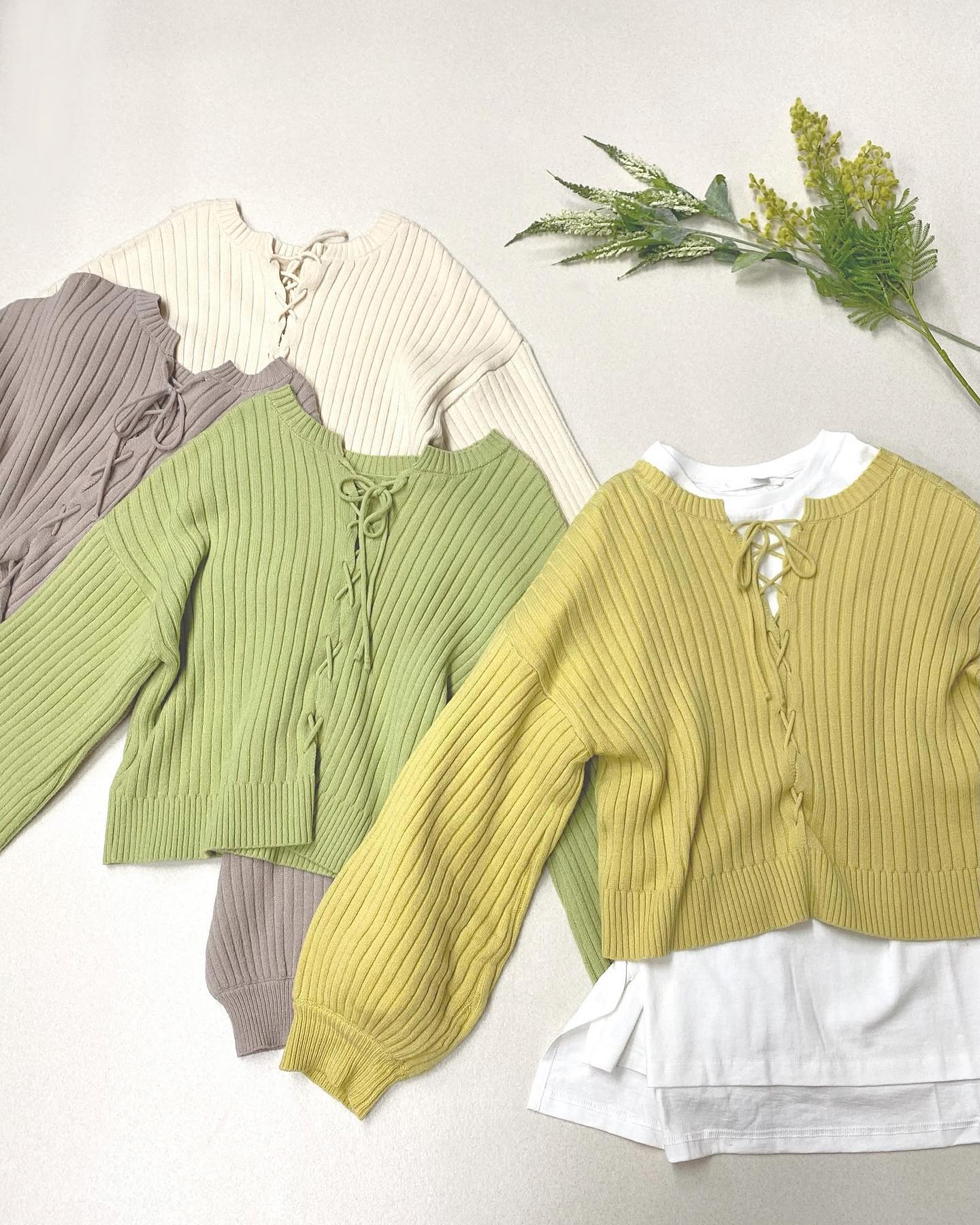 .【new arrival】?RU080012T001 モチモチレースUP2WAYニット▷¥2,530(税込)(店舗今週入荷.オンライン予約受付中)∥color∥ white / L grey / yellow / green前後どちらでも着られる肌触りがきもちいい春ニット#retrog …