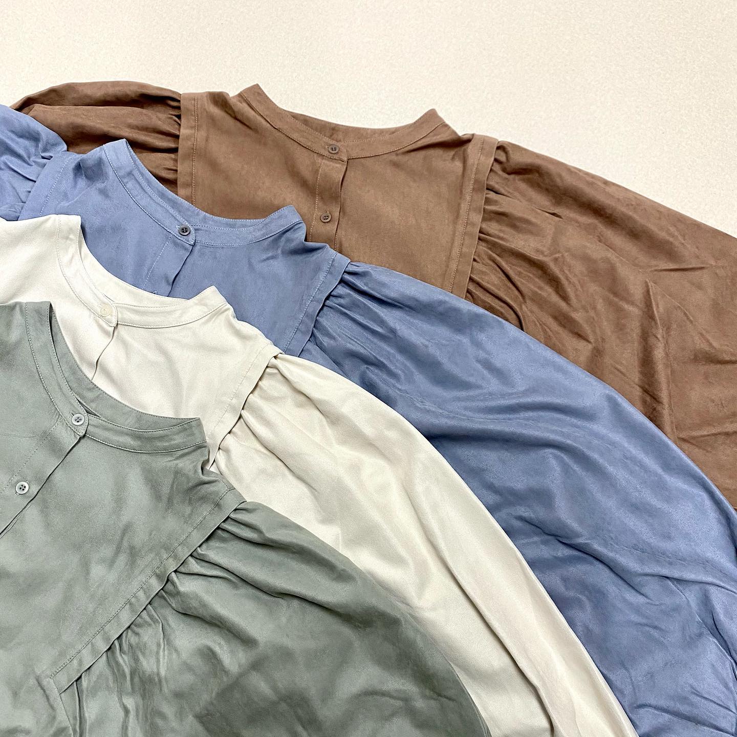 .【new arrival】?RU080023T001 肩タック袖ボリュームシャツ▷¥2,750(税込) (店頭、オンライン入荷)∥color∥ ivory / brown / green / blue前後2WAYで着られるブラウス着回しが効くのでstaffからも大好評!チュニック丈でミニ丈や …