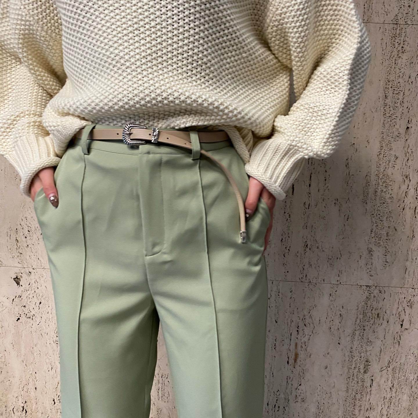 .【new arrival】?RP180032B001 ベルト付きセミフレアパンツ▷¥3,190(税込)(店舗今週一部入荷.オンライン入荷中)∥color∥ ivory / green / black / checkもはや定番のセミフレアパンツ春らしいお色でご用意ベルトも春らしくて …
